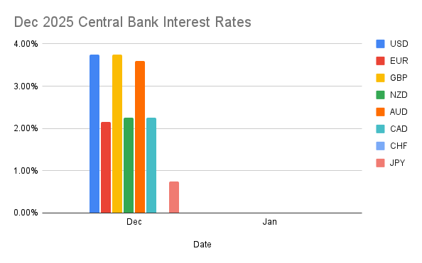 - Rates and yield differentials still matter: policy rates (e.g., USD 3.75%, GBP 3.75%, AUD 3.60%, EUR 2.15%, JPY 0.75%, CAD 2.25%) and 10-year yields (e.g., US 4.169%, UK 4.377%, Germany 2.091%, Japan 2.091%, Australia 4.676%) help frame carry incentives and funding currencies.