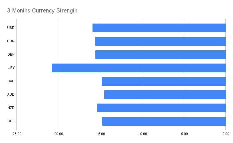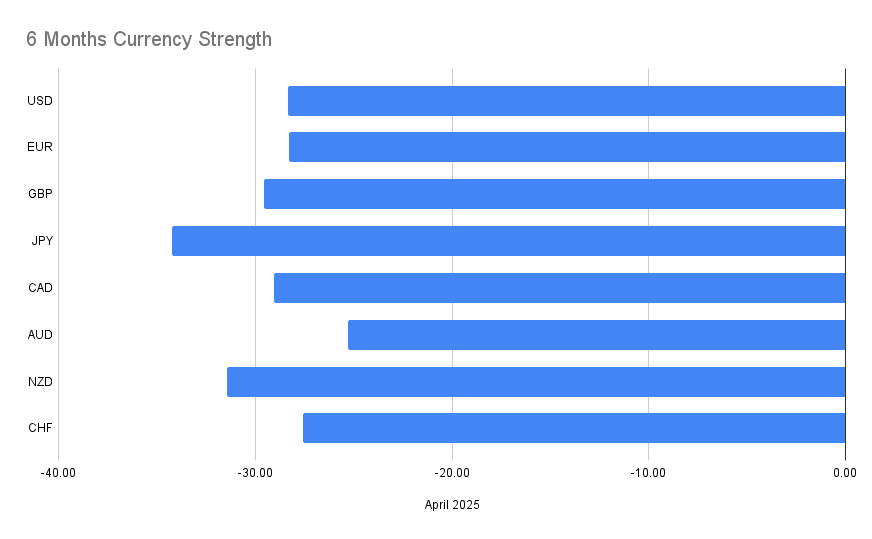 - JPY remains the weakest, reflecting continued capital outflows and yield disadvantage.