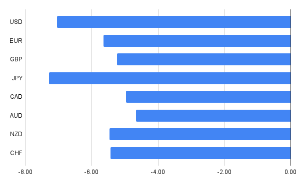 - EUR and GBP follow, while CHF holds up slightly better.